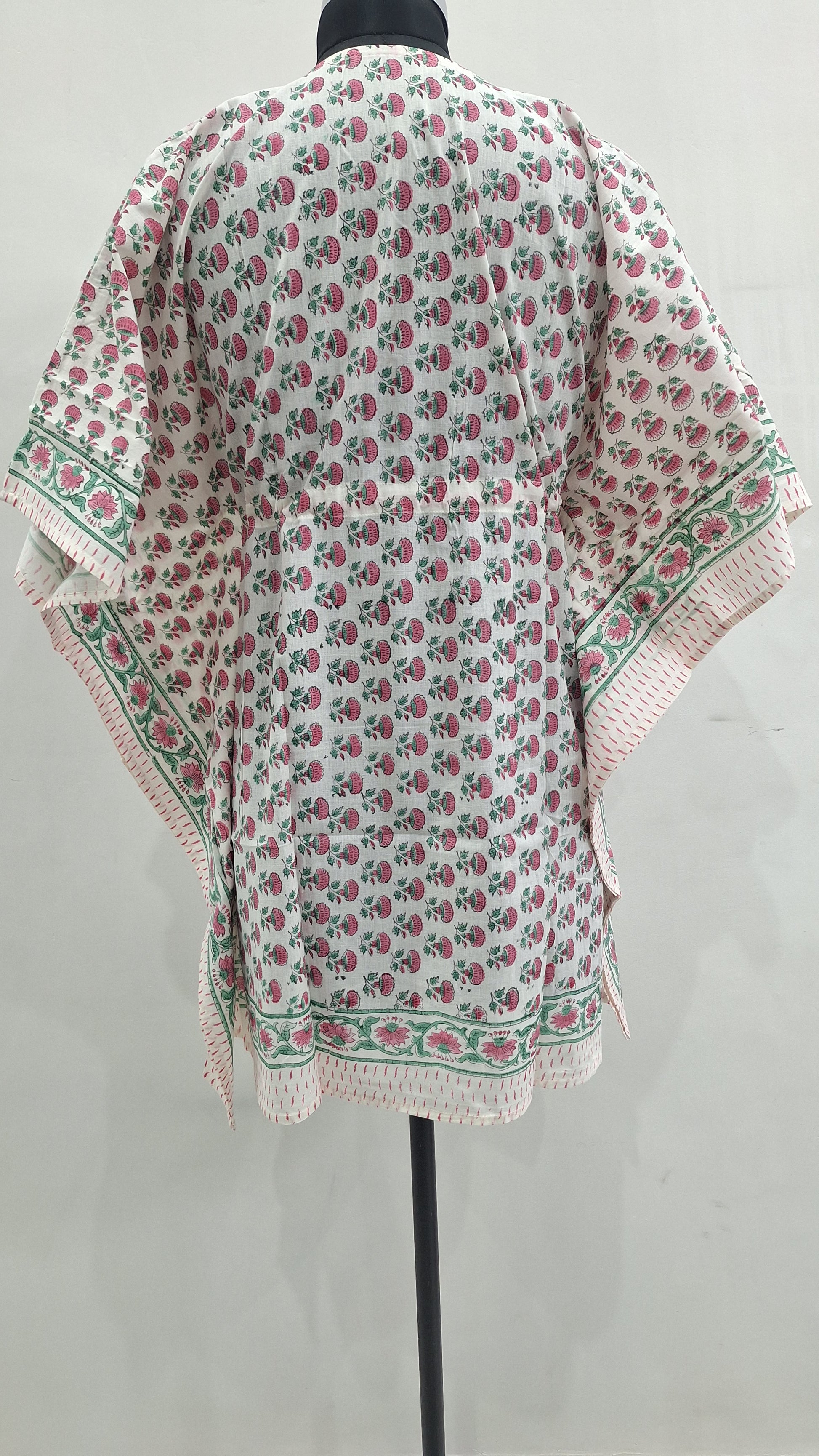 Featuring a charming pink floral hand block–inspired print on a soothing white base, this kaftan blends traditional artistry with modern comfort. The V-neckline, relaxed silhouette, and adjustable waist tie provide a flattering fit while keeping it easy and comfortable to wear. Finished with contrast printed borders on the sleeves for an elegant touch.